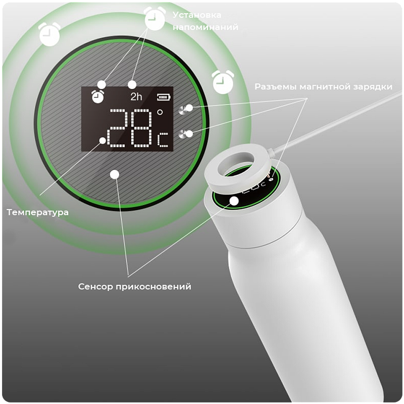 Бутылка-термос имеет сенсорный экран, на котором отображается температура жидкости, налитой в бутылку. Также экран отображает настройки звуковых напоминаний и уровень заряда батареи.